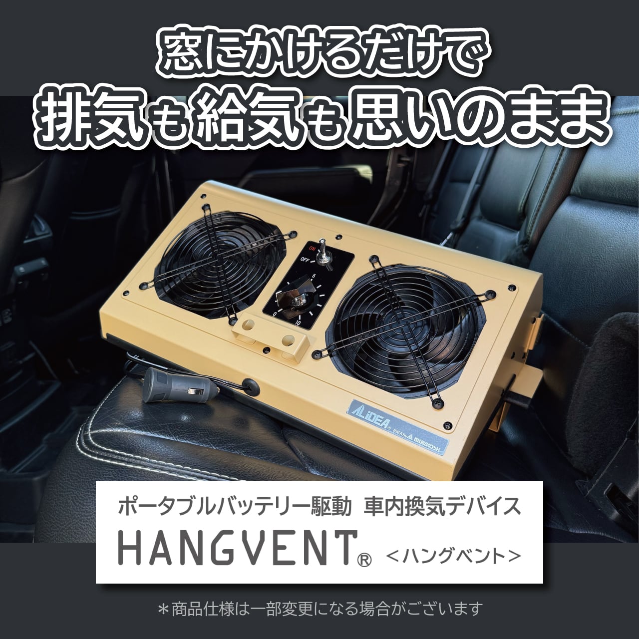 「ハングベント」は“駐車時に車の窓ガラスに設置するポータブルバッテリー駆動の換気デバイス” です。エンジンを止めた状態で、車内のこもった空気を換気し快適な空間を維持できます。
